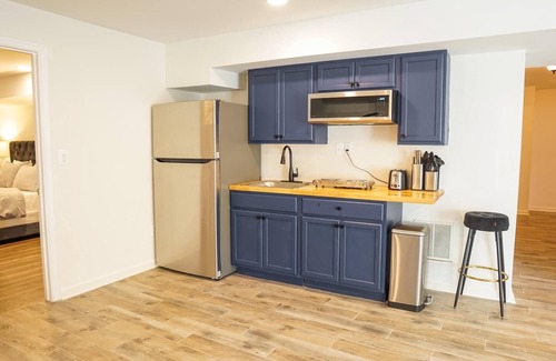 For longer stays, enjoy a fully equipped kitchenette, a private bathroom with excellent water pressure, and the convenience of an all-in-one washer/dryer. We live upstairs, providing a sound machine to mitigate any noise from our steps, ensuring a comfortable experience.