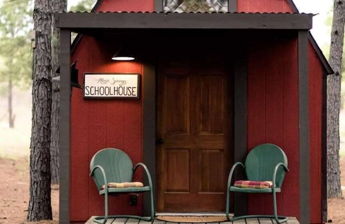 Our brand new, wonderful listing at Music Springs, 5 miles north of Hawkins, Tx, is The Schoolhouse! Created like an old, tiny one room schoolhouse, this space is cozy, romantic and perfect for a couple wanting to get away for a night, a weekend or a week!
