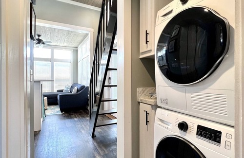 THE LOFT is accessible by stairs with a railing, no ladder. It has 2 twin mattresses with enough space left to play! It does not have full height ceilings. All linens provided.