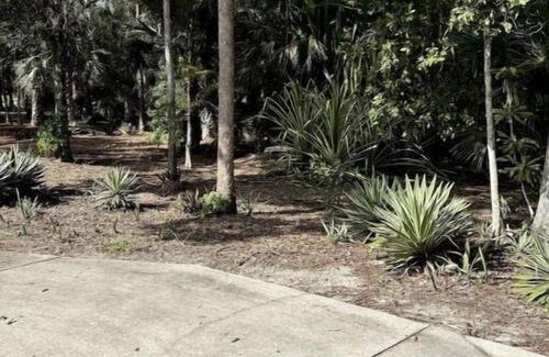 Property has lush greenery all around. Many fruit trees and varieties of palms. Owner is a floral designer who grows greenery for her designs. Absolutely beautiful foliage. The property is designated as a Certified Wildlife Habitat.