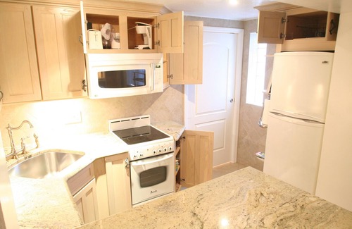 Delicious choice of coffees and a full kitchen to make and keep fresh food daily, on your wide granite breakfast bar and counters : refrigerator, stove, oven, microwave, dishwasher, deep sink w/light disposal,...blender, pots, pans, crockery, cutlery, steamer, toaster, filtered water pitcher, bottled water to get you started, coffee maker, creamer, sugars, cooking oil; and of course plates, coffee cups, glasses and bowls, recycling and trash. We provide paper towels and nice TP.