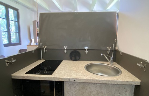 The small kitchenette is hidden away in a cupboard in the entrance hall.