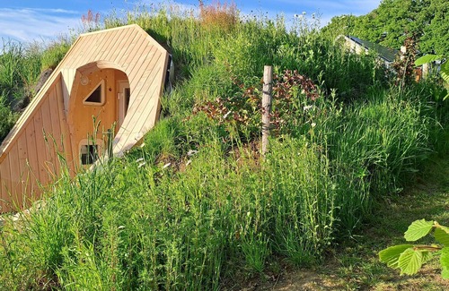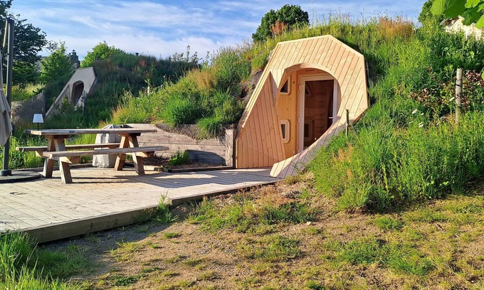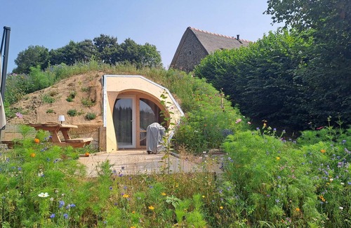 Designed to accommodate up to four people , this semi-buried accommodation , with its gentle curves and warm, raw materials, envelops you in a peaceful and friendly atmosphere.