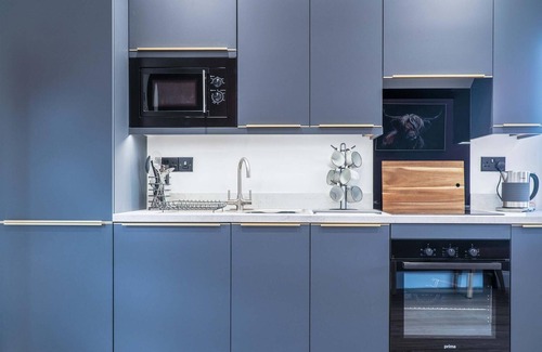 Upon entering, guests are welcomed into the inviting open-plan kitchen and living area. The kitchen boasts modern amenities including an oven, hob, microwave, and a convenient fridge with a freezer drawer. The cosy living space features a comfortable sofa and armchair arranged in front of a large smart TV for entertainment.