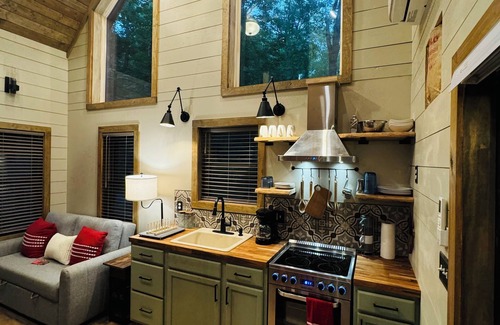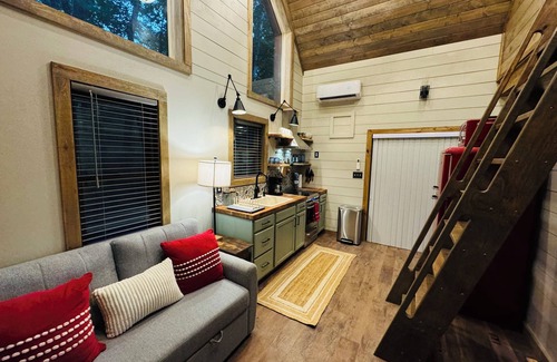 The Shack boasts 500 square feet of enchanting interior space. It features a cute kitchenette and a snug living room with a hideaway dining table. It has two cozy bedrooms with queen beds; one on the main floor and another via a loft-ladder! You’ll love the beautifully tiled bathroom with heated floors and a large walk-in shower, keeping you warm and comfortable even on cooler days.