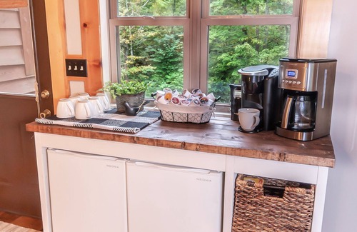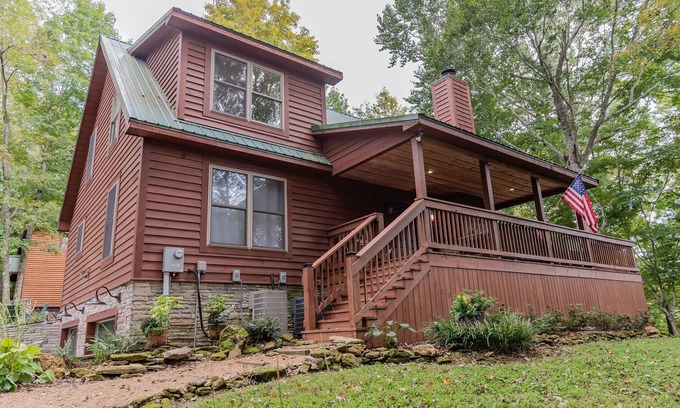 The cabin is newly furnished and extra cozy. It's well equipped with lightning fast fiber optic WIFI, Smart TV, a full kitchen, coffee bar, and an extra-long dining table. All beds are brand new and all linens are white. Outside you'll find the hot tub, firepit, and lots of rocking chairs and seating options.