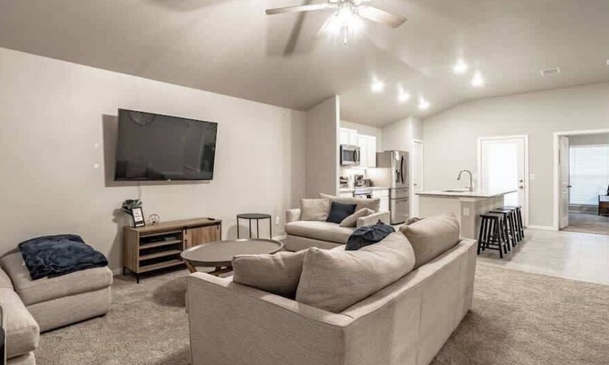 Welcome to our brand new home in the Bell Farms Subdivision in South Lubbock. Treat yourself to a wonderful stay at this 3-bedroom, 2 bath home in a newly developed neighborhood 15 minutes from Texas Tech. This location is perfect for small and large groups alike. This house features 1 king bed, 2 queen beds, and 1 twin. There are also high quality couches for an extra guest, a 65-inch TV with Netflix access, fast Wi-Fi, a fully stocked kitchen for all your cooking needs, and new furniture and mattresses for great rest!