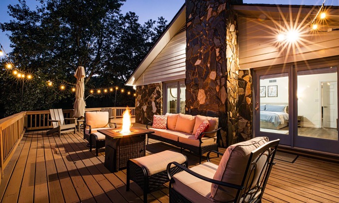 - Outdoor Enjoyment: Relax by the fire pit or grill on the wrap-around deck, which features charming string lighting for enchanting evening celebrations.