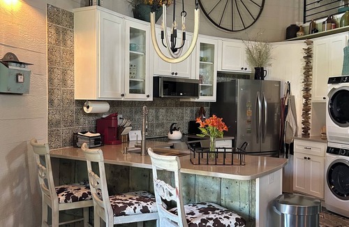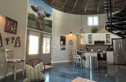 Convenient designated parking next to secure private entrance. Well-lit and safe for nighttime arrival. Keypad for easy self check-in at any hour! Guests have access to the entire 1/2 acre property and silo guest home. Your privacy is guaranteed!