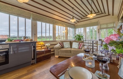 Set amidst the landscaped grounds of the owner's home and surrounded by beautiful rolling countryside,The Signal Box has 'upside down' accommodation with an open-plan living space on the upper floor to take full advantage of the wonderful rural views from the tall windows that fold around on three sides. Downstairs there is a cosy double bedroom with en-suite shower room.