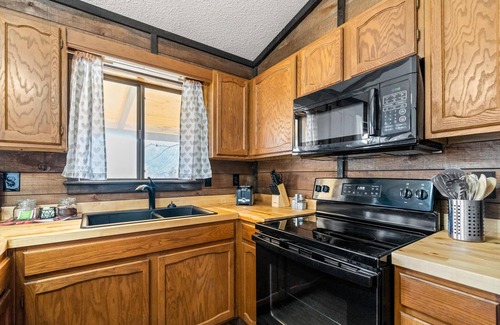 The cozy cottage offers a well-equipped kitchen to cook a full meal. A washer and dryer located next to the kitchen will bring the convenience of home.