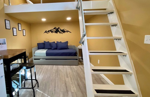 Step into retro mountain magic at The Ski Haus Tiny Home—a 270 sq. ft. getaway bursting with vintage ski lodge charm and cozy Colorado style. Thoughtfully designed for both comfort and character, this tiny home sleeps up to four with a ground-level queen bed and pull-out couch downstairs.