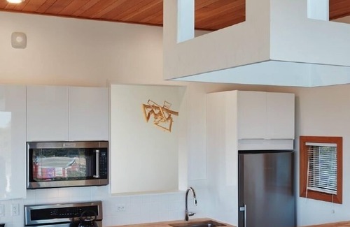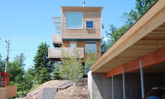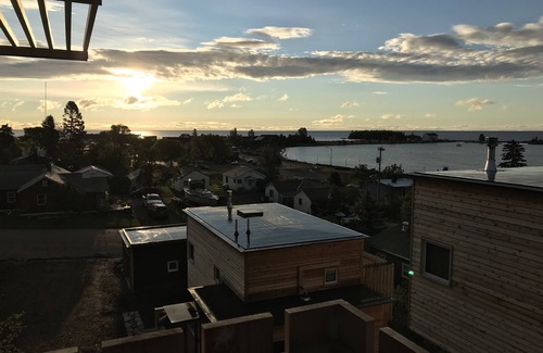 Welcome to the SkyHouse! This home was featured in Mn Monthly, Arch Magazine, Midwest Home, among others, and has won awards around the globe. Other than her sister properties the Horizon, and the smaller Aurora, there is nothing like this anywhere on Earth. These are unique, and are a limited design intended to inspire. Enjoy the unique beauty of Grand Marais and the harbor from the panoramic window views of this beautiful home. Designed by celebrated Minnesota architect David Salmela to capture all the needs and dreams of a visitor to Grand Marias. Come enjoy this cool cabin in America's "Coolest Small Town". By design, the Sky House provides for all the needs of a vacationing party of up to 6 people in a 1264 Sq. Ft. home but 4 people are ideal. We are a dog friendly stay with the payment of the appropriate fee and understanding of the rules. The Sky House provides an inspiring, modern space that allows for privacy among those sharing the lodging, and also provides a breathtaking great room area on the top floor with fantastic views of the Grand Marais harbor, the neighborhood, and the town. Everything is in short walking distance from our micro community right in the heart of Grand Marais. Every restaurant, bar, coffee shop, gallery, and Grand Marais' famous beach are all a very short stroll from this private residence. The home is designed in modern Nordic fashion. The design is contextual architecture that completes a timeline of Scandinavian and Nordic design that the owners began on the property next door that also honored northern buildings in the roots of their designs. There is off street parking under a sod roofed carport. There is also an electric car charging station in the car port. Walk up to the entry area and pass under the arch to the first of 3 decks where there is room to store bikes in summer, and once inside, there is plenty of room to shake off the snow, hang the coats and set down the skis or snowshoes. Each bedroom is very private is separated from the other by a soundproofed floor and ceiling for maximum privacy. Each bedroom also has its own restroom with shower, work station, free standing closet, queen bed, and balcony or patio with great views for getting away from the group. Continuing up the inspiring staircase leads you to the primary gathering area on the top floor. This area is breathtaking with its expansive windows, view of the town and harbor, Lake Superior and the grounds. It is simply the best view from a lodging in Grand Marais. There is a fully modern and capable kitchen, an architect designed built in sofa for single sleepers, and a contemporary gas fireplace. The sofa can sleep one adult or two children as is, or it can be modified to sleep one adult above and one adult on floor cushions. Note the unique skylight with natural light filtering treatments and the push button electronic pop up television that you can leave hidden if you wish. There is also a wrap around deck on this top level with fantastic view of the rooftops and harbor and the town and of course Lake Superior. There is a utility room with full size washer and dryer. Everything about the Sky House is designed with environmental sustainability in mind. These homes have an incredibly small footprint both structurally and environmentally. The foundations were designed to take up as little of the yard as possible- by being small at the start and increasing as you go up just like the old Stabur upon which this design is based. No cost has been spared to make the Sky House the highest quality, most significant architectural addition to Grand Marais' beautiful landscape. We hope you will find it warm, welcoming, and a once in a lifetime experience in one of the world's most magical places. Sauna is available on a first come first served basis and is private- message owner to verify availability prior to completing your reservation.