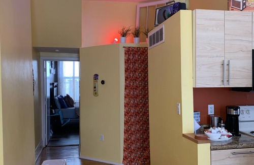 The KITCHEN is decked out with everything you’ll need for preparing meals at home. If it’s not there, we want to know so we can add it! Take a peek through our cabinets and drawers - you’ll find spices and herbs, pots ’n pans, baking dishes, cutting boards, knives, and many other helpful items. We offer a Cuisinart single serve coffee maker, designed to brew a coffee pod (provided) or fresh whole beans (provided). It brews both! We also have a hot/cold milk frother (buy your favorite dairy or non-dairy at the gas station around the corner on Russell St. or at the gas station a few houses up toward Johnson St.).