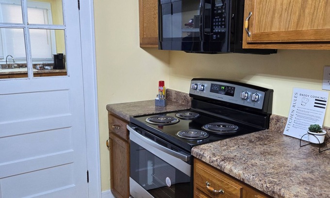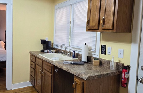 Keep it simple at this tiny house in Russell Springs. It sleeps 2 in one queen sized bed. There is a full bathroom accessible through the bedroom with a shower. There is a relaxing & comfy open concept living room with dining and fully equipped kitchenette. There is a television in the living room and the bedroom has its own television as well with free high speed Wi-Fi. It is a great place to stop and "Sleepover" on your way through Russell Springs.