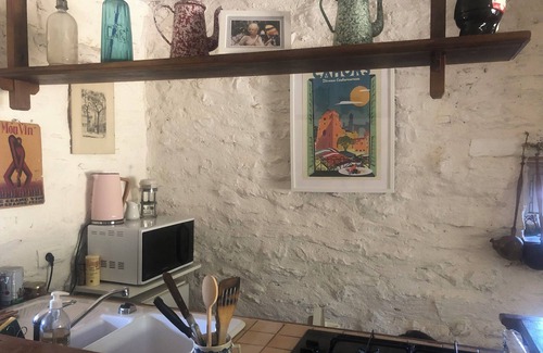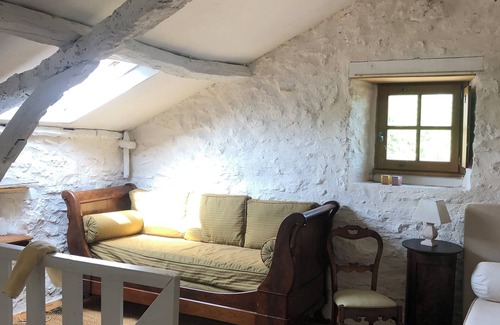 In the old stone barn adjoining the house but with its own entrance (former sheepfold), we offer a small gîte for two, consisting of a bedroom under the roof (very comfortable 160 bed) and on the ground floor a dining area overlooking the garden with simple but complete kitchen in its bar (the dishes will be done by hand), private bathroom with large bathtub and separate toilet.