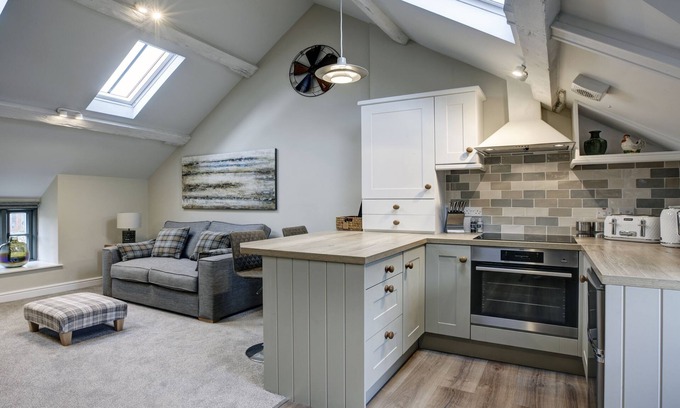 Heading up the rustic stone staircase and stepping inside, the cosy living room and open-plan kitchen provide an ideal space to renew and relax after a day of exploring. The plump sofa and recliner invite indulgent evenings spent watching your favourite film and the farmhouse kitchen and breakfast bar make the perfect space to rustle up a local feast and enjoy a refreshing glass or two.