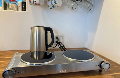The large front deck is complete with Adirondack chairs, a dining area and an electric Weber bbq. The kitchen is equipped with a toaster oven, portable electric cooktop, mini fridge, kettle and French Press Coffee Maker. Organic Coffee and a variety of teas are provided but milk is not due to personal preferences.