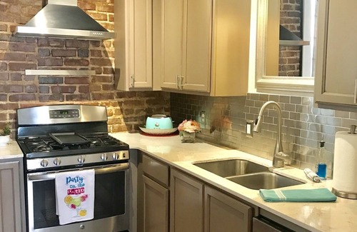 Step through the antique glass door to a historic bathhouse-quality experience in this luxury bathroom complete with glass shower and double pedestal sinks. Exposed brick is the inviting theme making this modern bathroom sing with southern “good ole days” flare. With a charming master bedroom, you will sleep like a baby in a king-sized opulent bed surrounded by a picture window, exquisite brick work and original hardwood floors. The second bedroom, with a queen bed, draws you in with a nostalgic insurance sign painted decades ago and an entertainment center and mini library; all over-looking the fountains of the historic downtown.