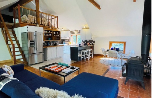 The guesthouse barn shares the ten acre property with the main residence where the owners live. Although the homes share the land, the guesthouse is private, with its parking directly in front. The original rustic exterior reveals a mid-century inspired designer furnished interior with open living space that includes a brand-new shower with heated floors, new bathroom fixtures, brand-new lighting throughout the house, and a private yoga studio with heated floors available upon request. The hayloft on the top level has been converted into a hangout space for meditation or lazy late afternoons apres skiing or hiking.
