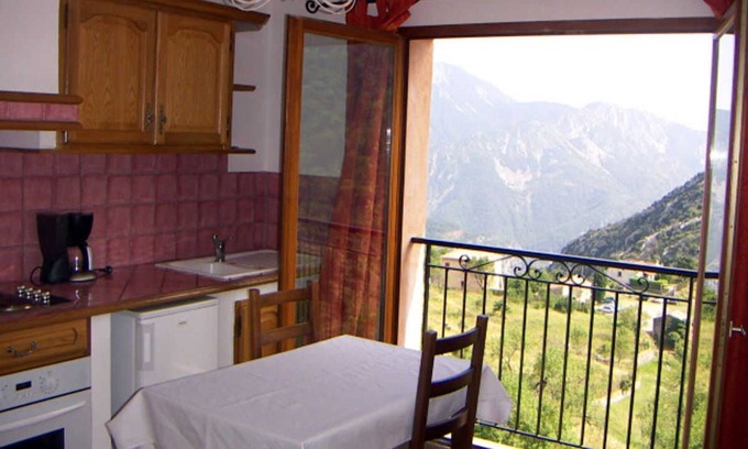 Gîte 'Les Ecureuils d'Utelle' on the 1st level of the house. Living room with 1 sofa bed for 2 people (140x190) with open kitchen. 1 bedroom with 2 single beds (90x190). Shower room, WC. Swimming pool of the Bellevue Restaurant adjoining the Gîtes, available to Guests. Parking. Electric heating. Including charges. Cleaning package on request. Tourist tax extra. Beautiful house comprising 6 Rural Gîtes in the heart of the small mountain village, at the gates of the Mercantour National Park. Adjoining swimming pool available in summer season. The town is particularly known for its pilgrimages to the Madonna of Utelle and its church, a listed historic monument. Near the Saint-Jean-la-Rivière bridge (10km) is the Vésubie canal which supplies the various villages as far as Nice. Possibility of numerous hikes, clues and canyons in the surrounding area...