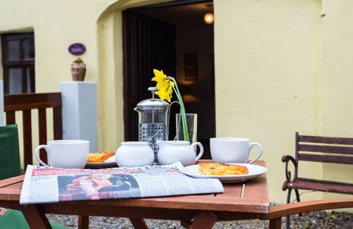 Amenities: Electric heating. Electric oven and hob, microwave, shared washer/dryer, FreeSat TV, WiFi and selection of books. Fuel and power charged by meter, first 20 Euros inc in rent. Bed linen and towels inc. in rent. Travel cot and highchair available. Off-road parking for 2 cars. Enclosed patio garden with seating. Shared courtyard. One well-behaved pet welcome. Sorry, no smoking. Village pubs, restaurants and shops 300 metres. Beach 400 metres. Note: There is an on-site laundry room with washer/dryer. Note: Barbecue available on request. Please note: This property does not take less than 4 night bookings during peak season.