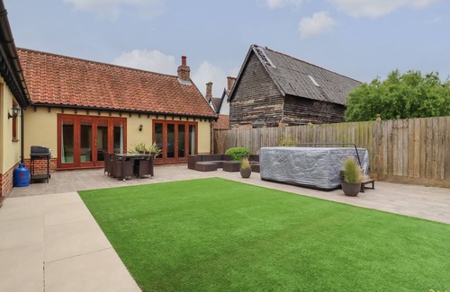 The living areas in this single-storey property consist of a kitchen/diner with an electric Range oven and hob, microwave, dishwasher, wine chiller, and coffee machine, a utility with fridge, freezer, washer/dryer, and a sitting room with Smart TV and a woodburning stove. The bedrooms consist of a double, a four-poster double, and a twin, along with a bathroom and a cloakroom. Outside there is an enclosed garden with artificial lawn, furniture, gas barbecue, and hot tub, and off-road parking for three cars. This is a pet-free and smoke-free property. Kindly note: No hens / stags or parties accepted. You'll find a shop in 2.4 miles and a pub in 2.3 miles. WiFi, fuel, power, bed linen and towels are all included in the price. The Stables at Hall Barn is a charming dwelling for a family break to Suffolk.