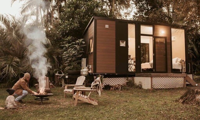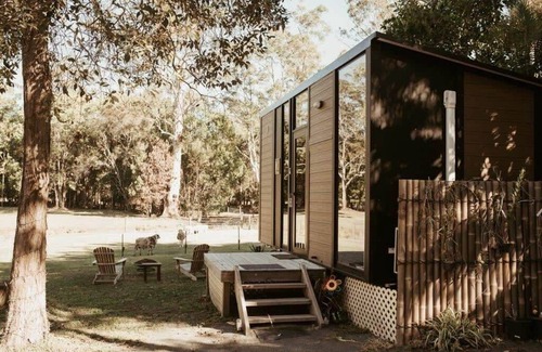 Guests can access the tiny home and its surroundings, including the communal pool, farm, creeks (or dams), and forested areas.