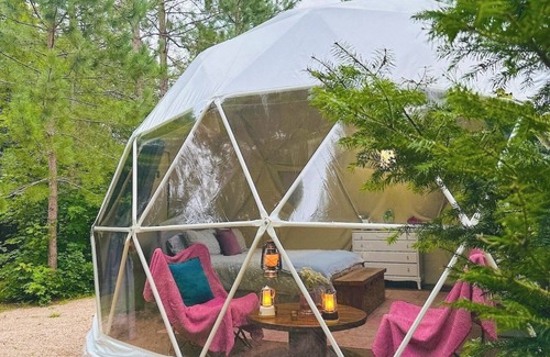 The Stargazer Geodome is glamping at its best. When you arrive the coziness of the geodome will welcome you in with its shabby chic decor and all you'll have to do is unpack and relax. Enjoy a drink while gazing out at the woodland view through the panoramic window, then stargaze through the skylight snuggled up in a cozy king sized bed.