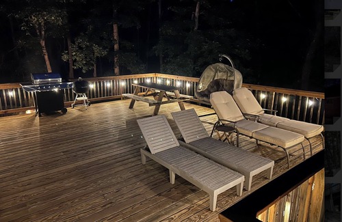 The deck features a gas BBQ grill as well as a charcoal grill, picnic table, swing chair, and 4 lounge chairs with a side table to take in the views, relax, dine, or play. String lights add to the nighttime enjoyment. Turn all the lights off for amazing views of the stars!