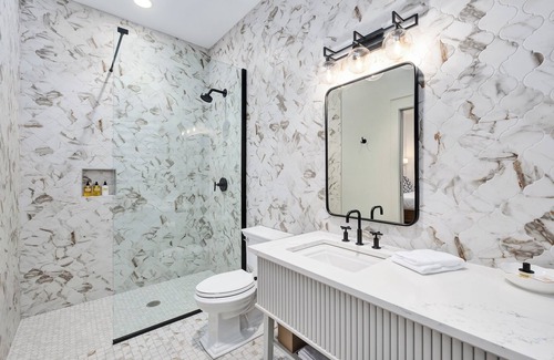 The suite’s spacious bathroom provides a refreshing zero-entry shower and is fully equipped with a Dyson hairdryer, luxury toiletries by D.S. and Durga, and luxurious Red Land Cotton towels, crafted in Alabama.