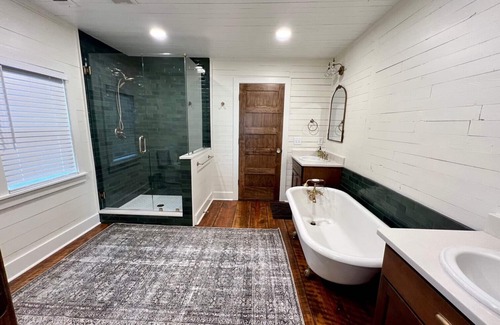 o 1 shower and 1 clawfoot tub, 2 separate sink vanities