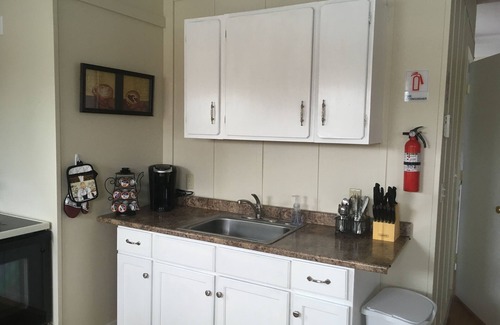The Studio is a spacious, open-concept 900-square-foot haven designed for relaxation and comfort. Located on the second floor and accessible by stairs, this airy space features a cozy queen bed, a welcoming living area, and a fully-equipped kitchen with everything you need to prepare meals during your stay. From utensils and dinnerware to a Keurig coffee maker, toaster, microwave, and stove, the kitchen is ready for your culinary creations. Enjoy your meals or catch up on work at the pub table, which doubles as a convenient workspace.