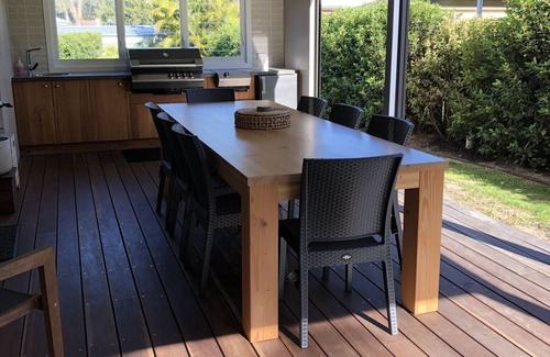 Bed and bath linen is provided, including the bed made with freshly ironed sheets. Bring your own beach towels. At the entrance to The Studio is a spacious, undercover deck and alfresco eating area with outdoor kitchen including BBQ, separate burner, sink with running hot and cold water plus bar fridge.