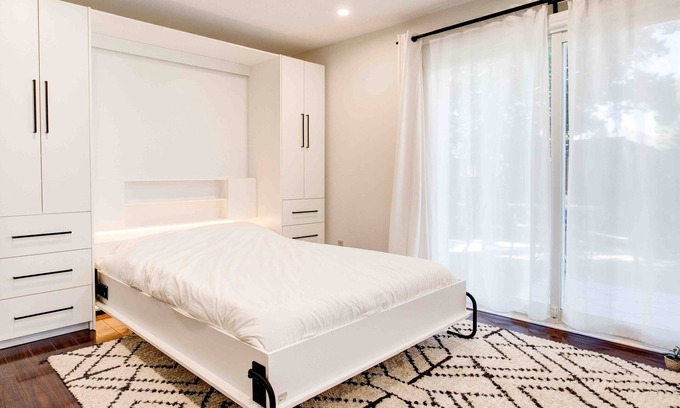 Large sliding glass doors lead to the private deck and shaded backyard. The room transforms from a cozy bedroom to a comfortable open living room thanks to a custom queen-sized wall-bed.