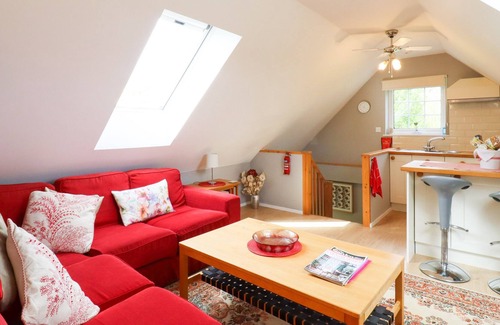 Amenities: Gas central heating. Neff electric hob, combi microwave/oven, washing machine, fridge, TV with Freeview, DVD, selection of books, games and DVDs. Fuel and power inc. in rent. Bed linen and towels inc. in rent. Travel cot, highchair and stairgate available on request. Off road parking for 2 cars. Bike storage. Shared use of owners' lawned garden with pond and summerhouse. Sorry, no pets and no smoking. Shop 0.8 miles, pub 0.5 miles. Note: Garage is situated underneath studio. Note: There is a pond in the owners' garden, children must be supervised at all times