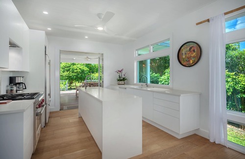 Impeccably Renovated Anini Beach Retreat: Complete with 3 Ensuite Bedrooms, 3.5 Baths, Sleeper Sofa, Front Lanai, Spacious Screened Back Lanai, Serene Fruit Grove, Ocean View from Master Suite. and only steps to the serene waters edge of Anini Beach. Experience The Sugar House, our North Shore Luxury Beach Home. (TVNCU#-4219 & SP-2011-13)