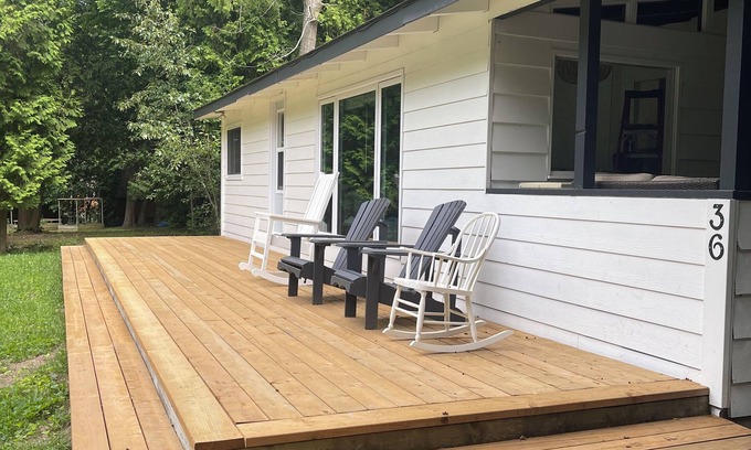 The cottage offers multiple outdoor seating areas, including a covered breezeway with a cozy conversation set, a new back deck equipped with a propane BBQ, a picnic table for outdoor dining and an outdoor globe fire pit surrounded by Adirondack chairs—perfect for roasting marshmallows. The expansive front deck is an ideal spot to enjoy your morning coffee and soak in the peaceful surroundings or enjoy at night, while stargazing.