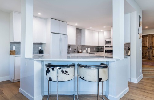 Inside, the vibe is bright and easy. Drop your gear in the generous entry, then sprawl out in the open living area. Big windows frame the hills of Elkhorn while the huge 85-inch TV begs for movie nights after big ski days. The fully stocked kitchen makes group meals a breeze, whether you're whipping up pancake breakfasts, après-ski snacks, or just uncorking a bottle and grazing at the island bar seating for six. When it's time to gather properly, the dining table expands to fit ten comfortably — laughter guaranteed.