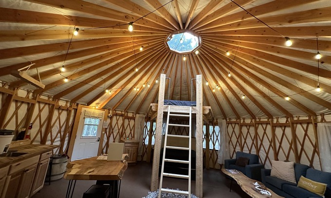 Inside the yurt you will find a kitchenette complete with a draining sink, Stanley insulated water jug, propane camp cook stove, enameled dinnerware set, Stanley cookware and coffee French press, silverware, knives, cutting board, and serving utensils. It is fully furnished with a bar table, 6 barstools, couch, 2 arm chairs, coffee table, and a timber frame loft area! The loft area has a lower queen bed and an upper queen bed. *Note* bedding is not provided. Up to two dogs are welcomed with a pet fee of $20/night per dog. Doggy bags are provided for pet clean up and are located at the front door. Ample hooks are placed throughout the yurt for hanging jackets and drying wet gloves and hats near the fire. The yurt is equipped with a small solar system that powers the 12v LED lights and 4 USB outlets for charging phones, laptops, and iPads. *Note* guests should bring any adapters needed to plug into USB ports. A guest binder inside offers instructions for the solar power, stoves, a site map, and Bethel area dining and activities guides. Outside, 4 adirondack chairs are placed under strings of lights. Solo stoves are included for outdoor fires year round at no additional fee along with stacks of firewood and cast iron fireplace tools. Baskets of fire starter and kindling and lighters or matches are available inside each yurt.