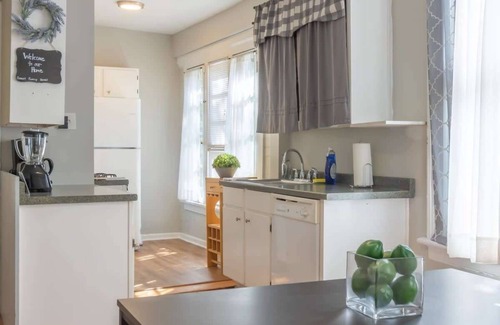 Enjoy a movie or sporting event in the living room. The couches center around a unique fireplace that no longer works, but it adds to the historic character of this great home! Cook up any meal in the fully stocked kitchen and enjoy outside on the rocking chairs and porch swing! During your stay, you will have full access to the front unit; the back unit is rented separately. Please inquire if you are interested in renting both together.