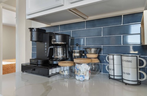 Full coffee bar featuring a Keurig, French press, pour over, and drip coffee maker (coffee, creamer, and sugar provided)