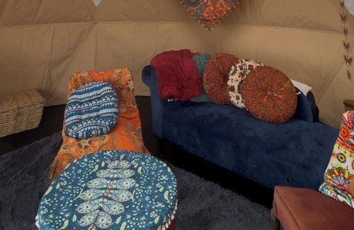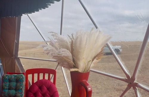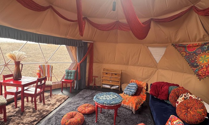 Welcome to your Glamping Experience!The Sunrise Hippy Dome is a warm, inviting space designed to inspire your mornings. With its vibrant reds and oranges, this dome reflects the beauty of the prairie sunrise, offering a perfect retreat for relaxation and rejuvenation. Decorated with a hippy flair, it's ideal for those who want to settle into plush pillows and blankets on floor beds (one queen and 2 singles), multicolored rugs, cozy chairs or loveseats, and hang out with friends or family.It’s ideal for playing games, reading, dancing, yoga, or just visiting with your loved ones. The Sunrise Hippy Dome features modern amenities, including a heater, lights, and a phone charger, ensuring both comfort and convenience. While this is a glamping experience, it still holds the essence of camping—you’ll take a short walk to the shared bathroom facilities (700-1200 feet away), immersing yourself further in the natural surroundings. Nestled at Healing Grounds, this dome offers a true escape into nature, where the rhythm of the prairie awakens your soul.Our cowboy kitchen offers a place to bbq and there is a small fridge that guests can share.