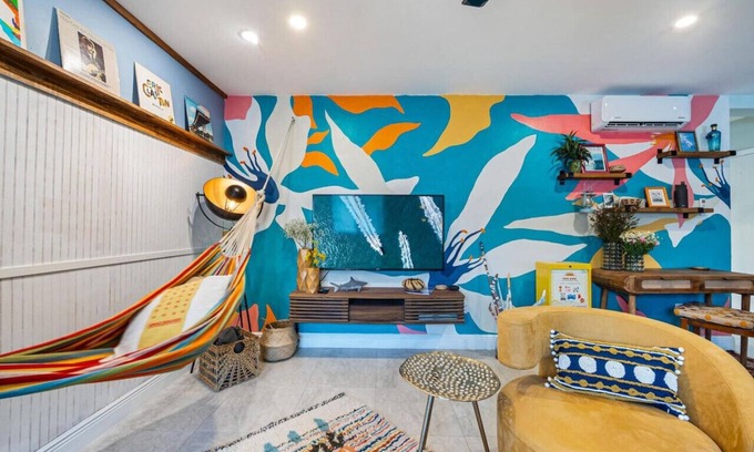 The apartment has a hand painted wall with various artistic details to make it very cozy.