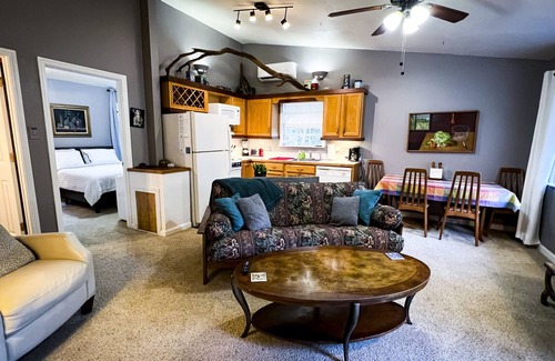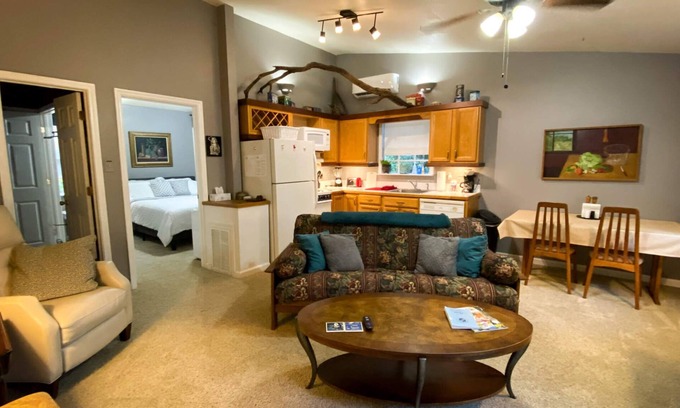 Situated in a natural setting, sits 7 Springs Hideaway. The Susannah is a unique, private, one bedroom/one bath, upper level, fully furnished apartment/condo. Features a solid oak kitchen with tile countertops, refrigerator with icemaker, stove, dishwasher, and microwave. Living/dining room has vaulted ceiling and track lighting. Bedroom has vaulted ceiling with ceiling fan. Back deck overlooks treetops. Heat and air with energy star heat pump. Washer and dryer. NO PETS ALLOWED. Please note this unit is upstairs and 19 carpeted steps. Parking for only 2 cars.