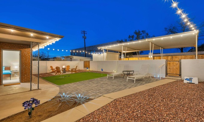 The Swing by Velo is a historic home located in a downtown Tucson neighborhood, next to Arroyo Chico Park. This home features 3 large bedrooms with two King size beds and a Queen. All mattresses are memory foam! A Queen size inflatable air mattress in the living room allows comfortable sleeping for up to 8 adults. Tastefully designed for family with children, our mini golf court, Arcade game machine, outdoor dining and fire pit will entertain guests all year round.