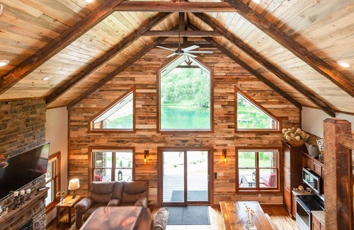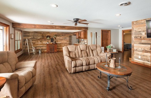 More than just a cabin, this spacious 3,000 sq. ft. home is located on a small private lake in the Richland Center area. The Sylvan Cabin at Mill Creek Cabins features antique décor, locally sourced materials, and handmade wooden furniture that give it the warm, rustic feel you expect from a cabin. The main floor is well lit by the large picture windows overlooking the water. The open floor plan leaves no shortage of space for entertaining on the main floor. If you do find yourself needing more space a second living room is located on the ground level!