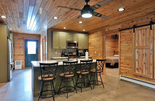 The Taj is a stunning new contemporary retreat, thoughtfully designed to combine modern elegance with cozy comfort, situated just above the garage. Step inside and ascend the staircase to an open-concept haven, complete with meticulous attention to detail. The full kitchen is a chef's dream, boasting stainless steel appliances, sleek granite countertops, and a central island that seats four—perfect for shared meals and lively conversation. The spacious living room invites you to sink into its comfortable furnishings, while the large dining table sets the stage for hearty meals, spirited card games, or puzzles. For a touch of fun, enjoy the built-in Foosball table, adding a playful vibe to your stay.