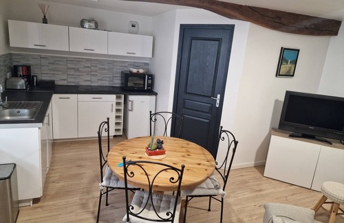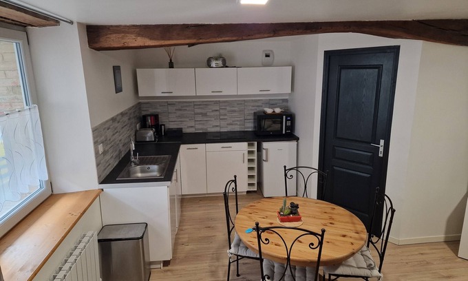 Small contemporary townhouse in the heart of Ornans composed of a kitchen open to living room, bathroom, living room with sofa bed, and a bedroom.
