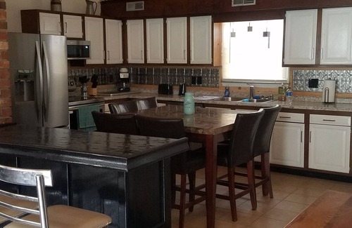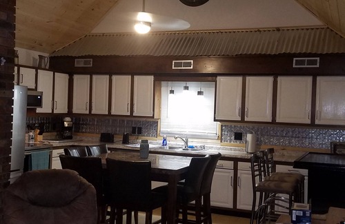 This beautiful home is very spacious with rustic décor. Has 4 bedrooms: 1 king in first bedroom, 2 queens in bedroom in #2, queen bed in #3, and futon in room #4. This house is spacious and can handle a big family but at the same time it is nice and cozy for just a small family. Nice private backyard with firepit.